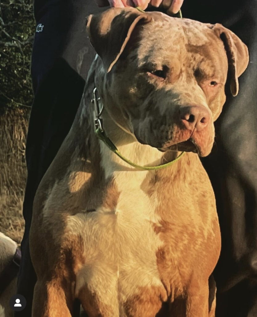 Amazing example of a male Xl, Chocolate Tri Merle Coat beautiful colours and markings. He has a massive head, broad chest, amazing stance, stands really tall and has excellent drive and a outstanding temperament brilliant around children and other animals, very protective of his territory around strangers.