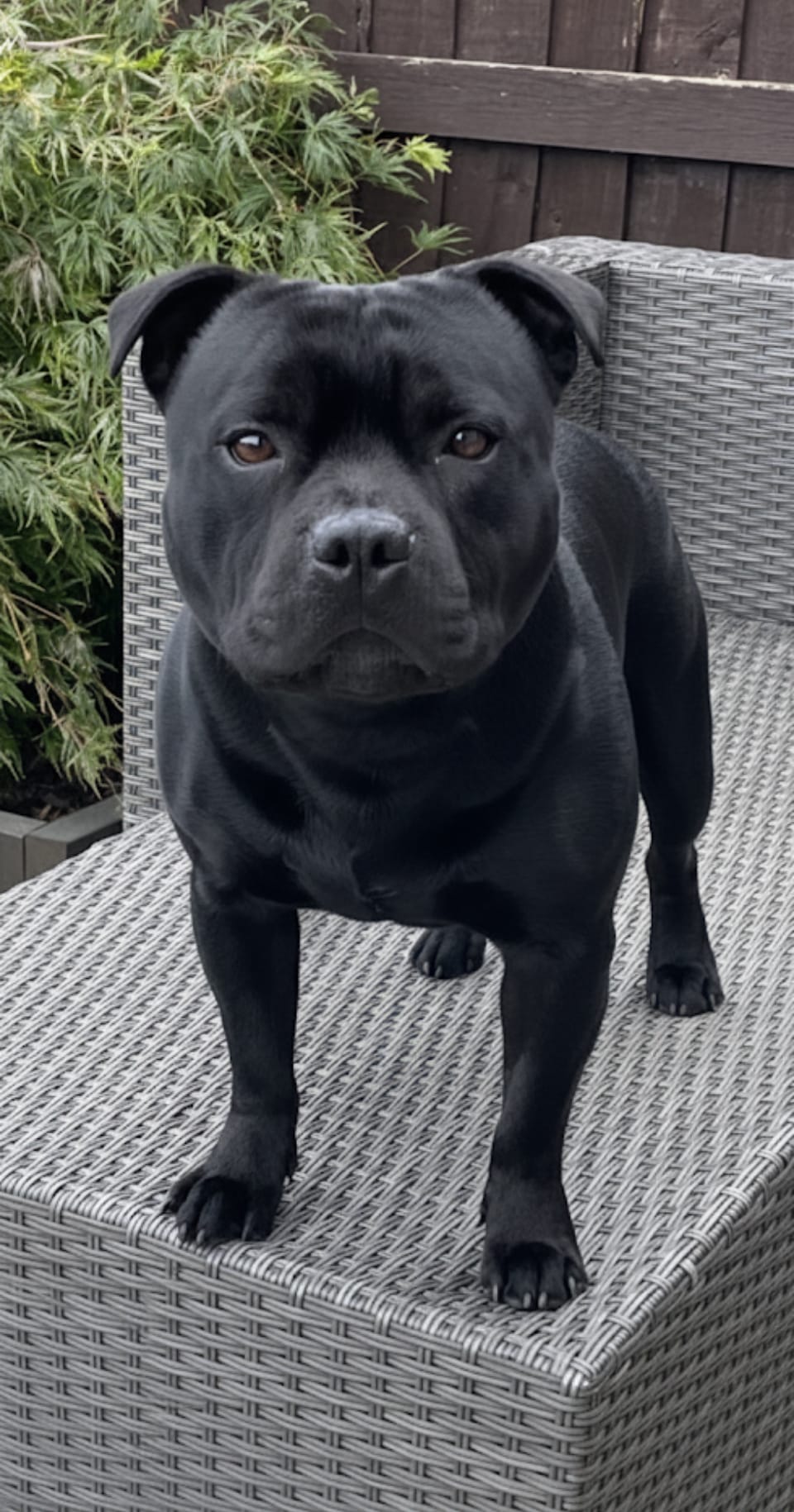 The Staffy King is the epitome of the Staffordshire bull terrier breed standard. Every feature, from his perfectly set rose bud ears, to his bully head, defined cheek bones and short muzzle and not forgetting his muscular well balanced structure meets the highest requirements. He boasts a solid jet black shiny coat with zero brindle and has matching jet black nails, a perfect scissor bite with brilliant white teeth.