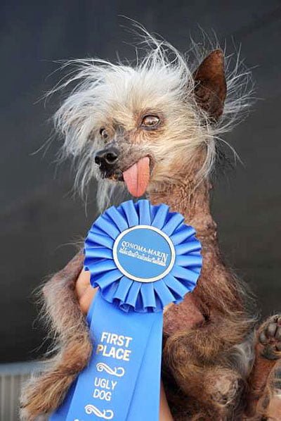 Miss Ellie won the pedigree category of the 2009 World’s Ugliest Dog Competition, but sadly she has now passed away. Chinese Crested dogs have a long and illustrious history of winning ugly dog contests, as the 2008 competition was also won by a Chinese Crested when Gus won the main event.